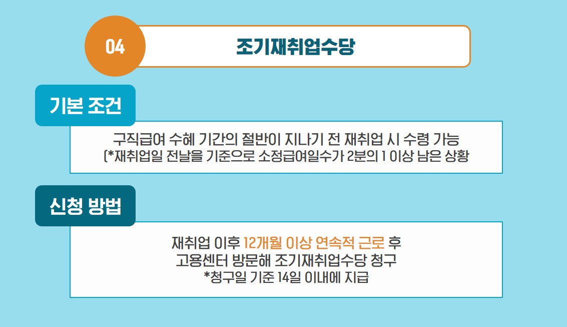 구직급여 수혜 기간은 퇴직 전 근무 기간에 따라 최소 120일부터 최대 270일 이내로 정해지는데요. 수혜자의 조기 재취업 촉진을 위해 동 기간의 절반이 지나기 전 재취업 시 ‘조기재취업수당’을 수령할 수 있습니다. 참고로 근로를 시작하는 일자가 아닌 재취업일 전날을 기준으로 소정급여일수가 2분의 1 이상 남은 상황이라는 점을 기억해주세요.