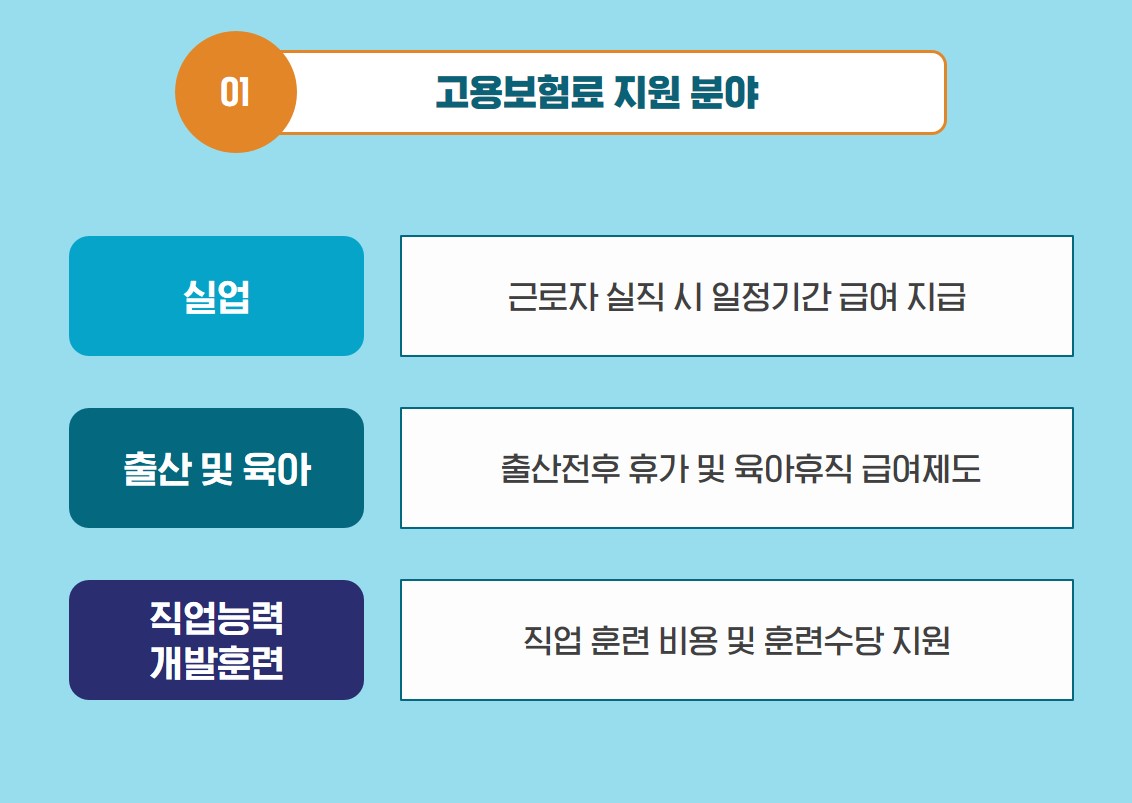 건강에 이상이 생겼을 때를 대비해 건강보험료를 내듯이, 고용보험료는 ‘고용이 불안정해졌을 때’를 위한 비용입니다. 현재 국내에선 실업, 출산 및 육아, 직업능력개발훈련에 대한 지원 방안이 마련되어 있는데요. 각 분야별 상세 정보를 한 번 살펴보겠습니다.