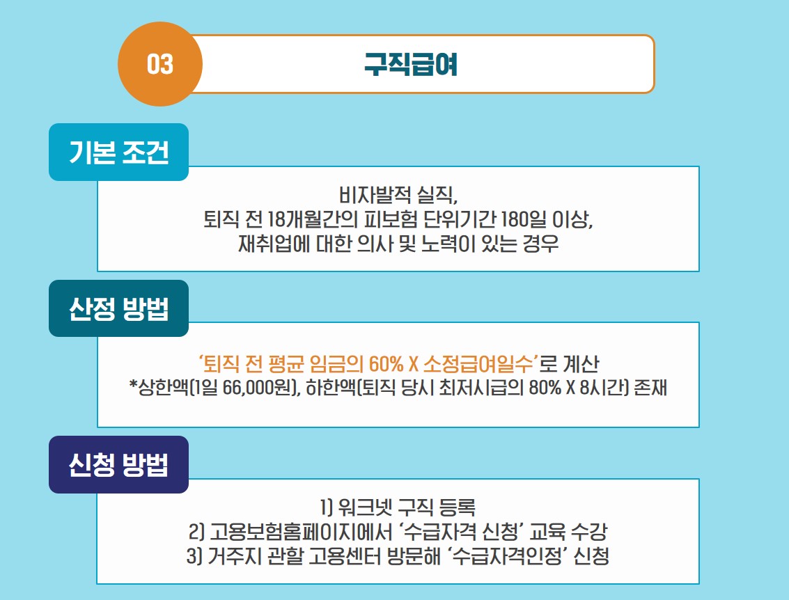 구직급여 수령 기준과 산정액을 알았으니, 이제 신청을 할 차례입니다. 가장 먼저 해야 할 일은 워크넷(https://www.work.go.kr)에 구직 등록을 해야하는데요. 이후 고용보험 홈페이지(https://www.ei.go.kr/)를 방문해 수급자격 신청 교육을 온라인으로 수강하면, 거주지 관할 고용센터에 방문해 ‘수급자격인정’ 신청을 진행할 수 있습니다. 만약 인터넷 사용이 어렵다면 직접 고용센터에서 오프라인으로 신청 교육 수강도 가능하답니다. 심사를 통해 자격을 인정 받으면 재취업활동과 더불어 구직급여를 지급 받을 수 있습니다! 인정을 받지 못한 경우에 대해 재심사 청구 절차도 마련되어 있으니 꼼꼼히 챙겨 주시기 바라요!