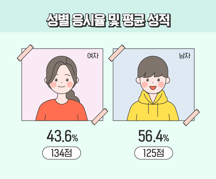 응시자 성비 및 성별에 따른 평균 성적은 어떤 차이를 보였을까요? 먼저 성별 응시율의 경우 '남성(56.4%)'이 ‘여성(43.6%)’보다 약 13% 더 높았습니다. 하지만 평균 성적은 여성(134점)이 남성(125점)보다 우수했네요. 더불어 지난 2019년(여성 131점, 남성 123점)과 비교했을 때 이성 간 점수차는 비슷하나, 전반적인 성적이 2-3점 올랐다는 점을 알 수 있었습니다.