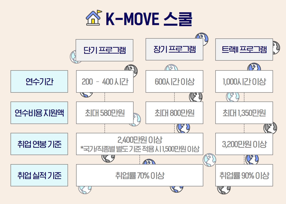 K-MOVE 스쿨 단기 / 장기 프로그램은 연수기간과 연수비 지원액에서 차이를 보입니다. 단기 프로그램의 경우 해외로 진출하기 전 200 - 400시간의 연수기간을 거쳐야 하는 반면, 장기 프로그램은 600시간 이상으로 긴 시간이 소요됩니다. 기간이 다른 만큼 연수비 지원액에도 차이점이 존재하는데요. 단기 프로그램은 최대 580만원, 장기 프로그램은 최대 800만원이 지원됩니다. 아울러 비자 발급에 필요한 금액 등 기타 비용은 최대 50만원까지 추가로 지급된답니다. 그 외 취업 연봉 기준과 취업 실적 기준은 각각 연봉 2,400만원 이상, 취업률 70% 이상으로 동일합니다. 단 연봉 기준의 경우 국가 및 직종별로 별도 기준(1,500만원 이상)이 적용될 수 있으니 유의해 주세요!
