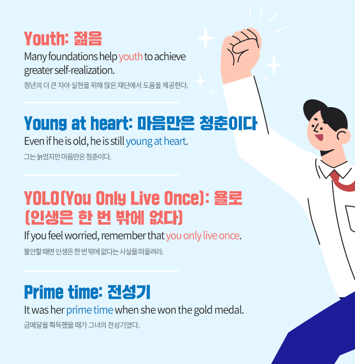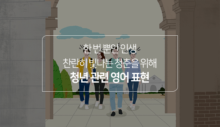 작년 9월, 대한민국 역사에 한 획이 그어졌습니다. 바로 청년의 날이 신규 법정기념일로 제정됐는데요. 어버이날, 스승의 날은 들어 봤어도 청년의 날이라니. 아직 낯설게 느껴지는 분들이 많을 것으로 예상됩니다. 간단히 설명 드리자면, 청년의 날은 청년 기본법 제 7조에 따라 청년의 권리 보장 및 청년 비전의 중요성을 알리고 청년 문제에 대한 관심을 높이기 위해 만들어졌다고 해요. 또 날짜가 고정된 게 아니라 매년 9월 셋째 주 토요일을 기념일로 택했답니다 :) 청년에 의한, 청년을 위한 날이 당장 코앞에 다가온 만큼 <토익스토리>도 가만히 있을 순 없겠죠. 청년에 관련된 영어 표현을 준비해봤습니다. 함께 만나보시죠 :)