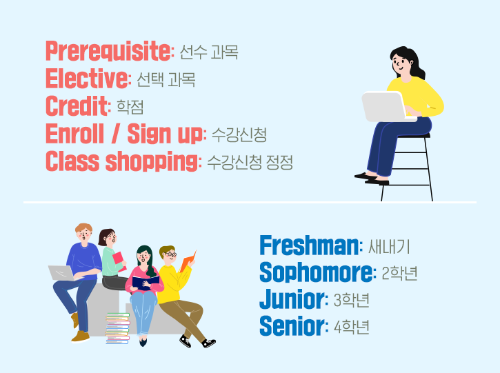 아울러 영어에는 4년제 대학 기준 각 학년별 명칭이 따로 있습니다. 1학년엔 'Freshman', 2학년엔 ‘Sophomore’, 3학년엔 ‘Junior’, 4학년엔 ‘Senior’가 쓰이는데요. 한국어를 직역한 First grade, Second grade 등은 초등학교를 비롯한 기초 교육과정의 학년이므로 주의해 주세요!