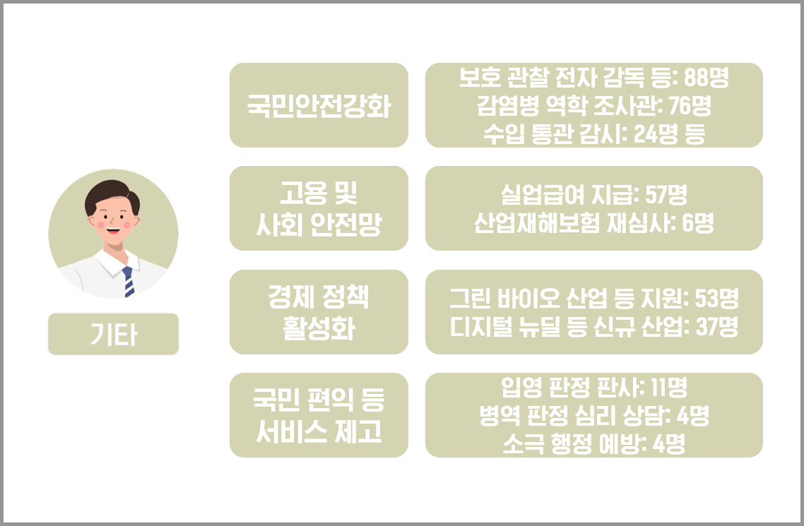 생활안전 등 기타 분야에선 1,190명이 채용됩니다. 국민 안전 강화를 위해 보호 관찰 전자 감독 등의 업무를 하는 인원이 88명이며, 코로나 팬데믹이 계속 되는 가운데 중요해진 감염병 역학조사관은 76명입니다. 해외에서 들어오는 제품의 통관을 감시하는 인력과 트라우마를 겪는 이를 위한 심리지원 인력, 건설 현장의 안전 점검 담당자도 채용할 계획이네요. 안정적인 고용 환경 및 사회 구축도 중요한 업무이죠. 실업자의 생활고 완화와 재취업 장려를 위한 실업급여 지급 직무에 57명이 할당됐습니다.