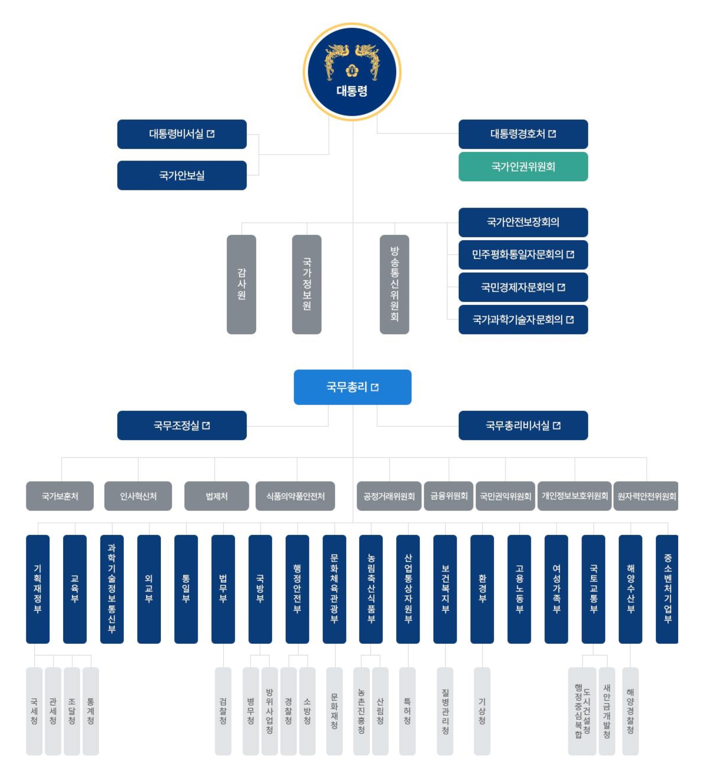 국가직 공무원의 일터는 정부라는 점, 다들 알고 계실 텐데요. 정확히는 정부조직(국가행정기관)에서 근무한다고 말할 수 있습니다. 용어가 낯선 분들을 위해 더 설명 드리자면, 정부조직은 중앙행정기관, 소속기관, 위원회, 하부조직으로 구성되는데요. 우선 중앙행정기관은 정부조직법에 의해 설치된 부, 처, 청을 의미하며 국가행정사무를 담당하고 관할권의 범위가 전국에 미친답니다. 많이 들어보셨을 외교부, 식품의약품안전처, 기상청 등을 예시로 들 수 있죠. 현재 대한민국 중앙행정 기관은 18부, 5처, 18청으로 이루어져 있답니다.