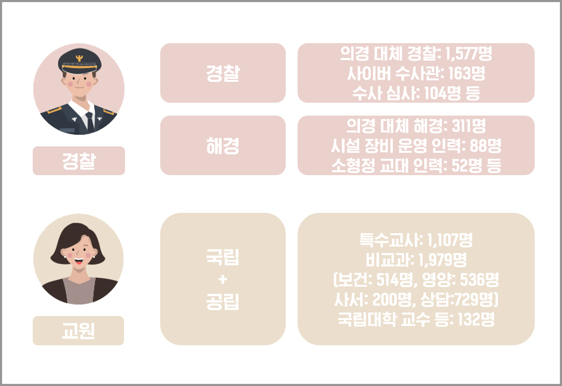 2,508명을 충원할 예정인 경찰부터 살펴보겠습니다. 먼저 2023년 의경 완전 폐지에 따른 대체 인력 1,577명의 채용이 계획되어 있는데요. 해경의 경우엔 따로 311명을 뽑는 답니다. 전국에서 공석을 채워야 하기에 상당한 수의 인원이 배정된 점이 눈에 띄네요. 최근 급증하는 사이버 범죄에 대응하기 위한 사이버수사관은 163명, 수사가 적법하고 정당하게 진행됐는지 심사하는 수사심사관은 104명의 채용이 예정됐습니다.