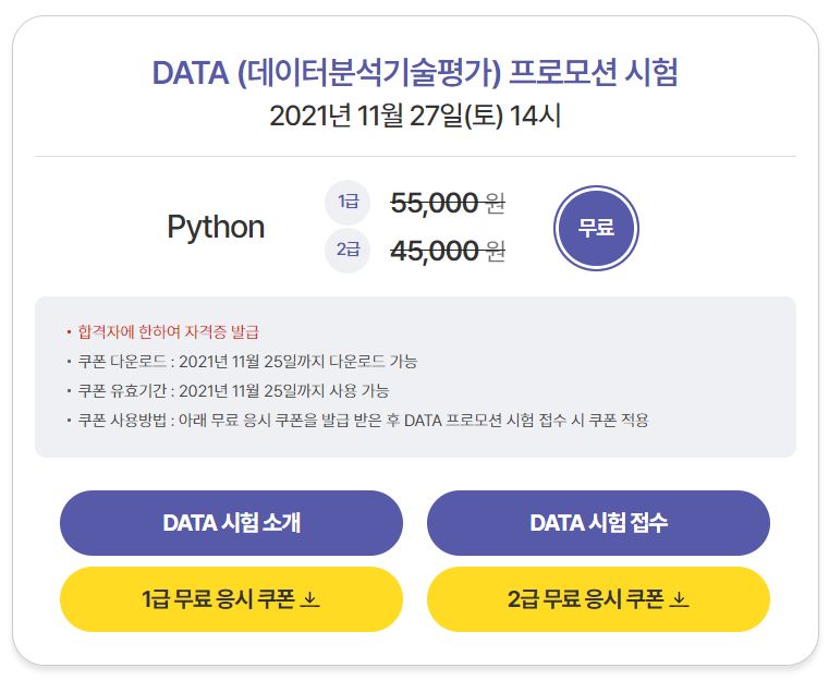 YBMIT에서 DATA 자격시험(데이터분석기술평가)를 출시했습니다. 출시 기념 이벤트로 데이터 분야에 관심 있는 분들을 위해 무료 응시 기회를 드리고 있는데요. 선착수 500명에 한해 Python 실력을 확인할 수 있으니 코딩 실력을 확인하고 싶다면 꼭 도전해 보세요!