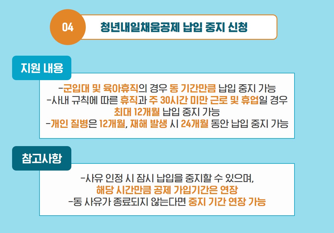 납입 중지가 허용되는 사유엔 여러 가지가 있는데요. 일단 병역의무, 육아휴직 및 육아기 근로시간 단축(주 30시간 미만) 등 개인 신분이 군인, 부모 등으로 바뀔 시엔 동 기간만큼 공제부금 납입을 중단할 수 있습니다. 또한 기업 내 규칙 및 단체협약에 따른 휴직과 회사 사정 상 주 30시간 미만 근로 또는 휴업이 결정되는 경우도 최대 12개월간 합당한 사유로 인정됩니다. 한편 몸이 아픈 것처럼 서러운 일도 없다는 말이 있죠. 신체 및 정신 건강을 온전히 챙기도록 개인 질병과 업무상 재해 발생 시엔 각각 12개월, 24개월 동안 납입을 멈출 수 있습니다. 참, 상기 사유가 종료되지 않는다면 중지 기간을 연장할 수 있다는 점도 챙겨주세요!