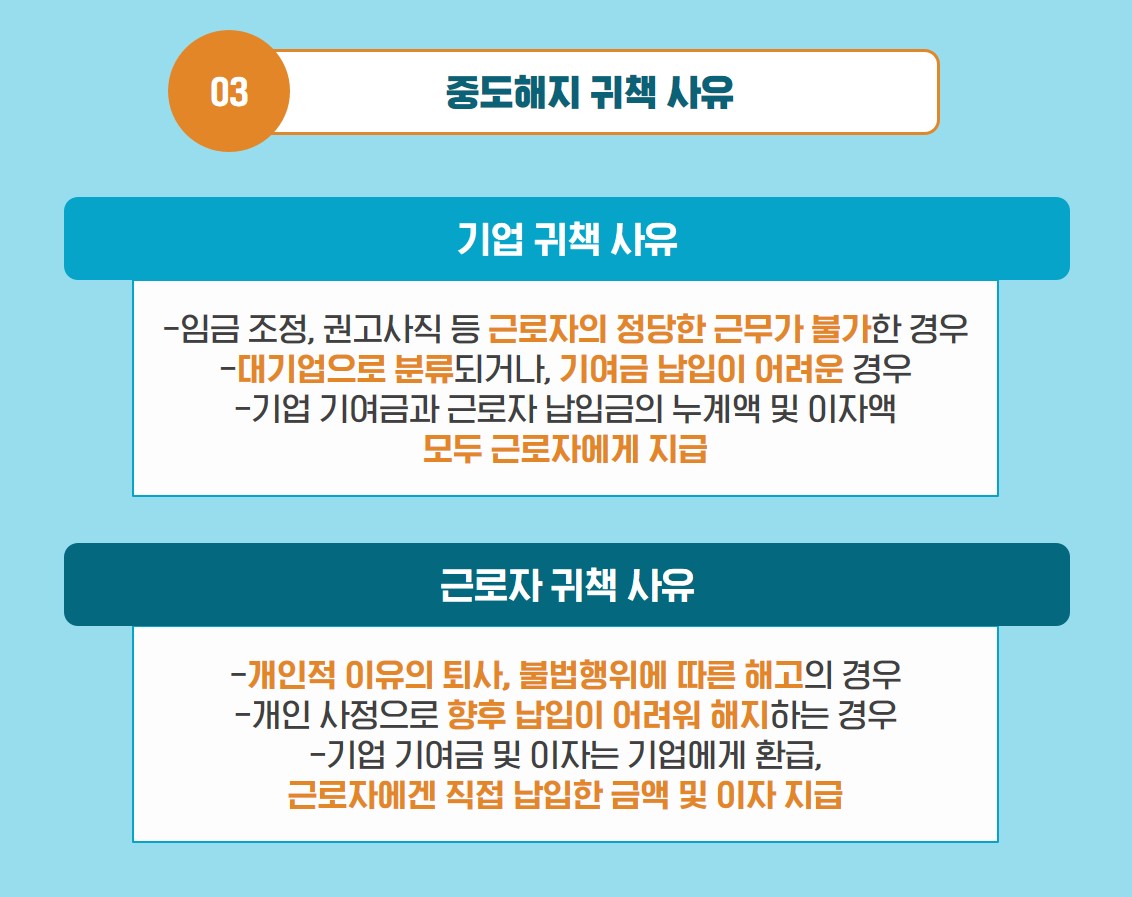 공제 만기까지 꾸준히 근무 생활을 이어가겠다는 다짐에도 불구하고, 여러 이유로 직장을 그만둘 수밖에 없는 상황이 다가올 수 있습니다. 중소기업 재직 기간 연장이 제도의 주요 취지 중 하나이기에 퇴사 시 자동으로 공제가 해지되는데요. 이럴 경우엔 퇴직 사유가 기업 귀책인지, 근로자 귀책인지에 따라 환급금 수령 액수가 달라집니다.