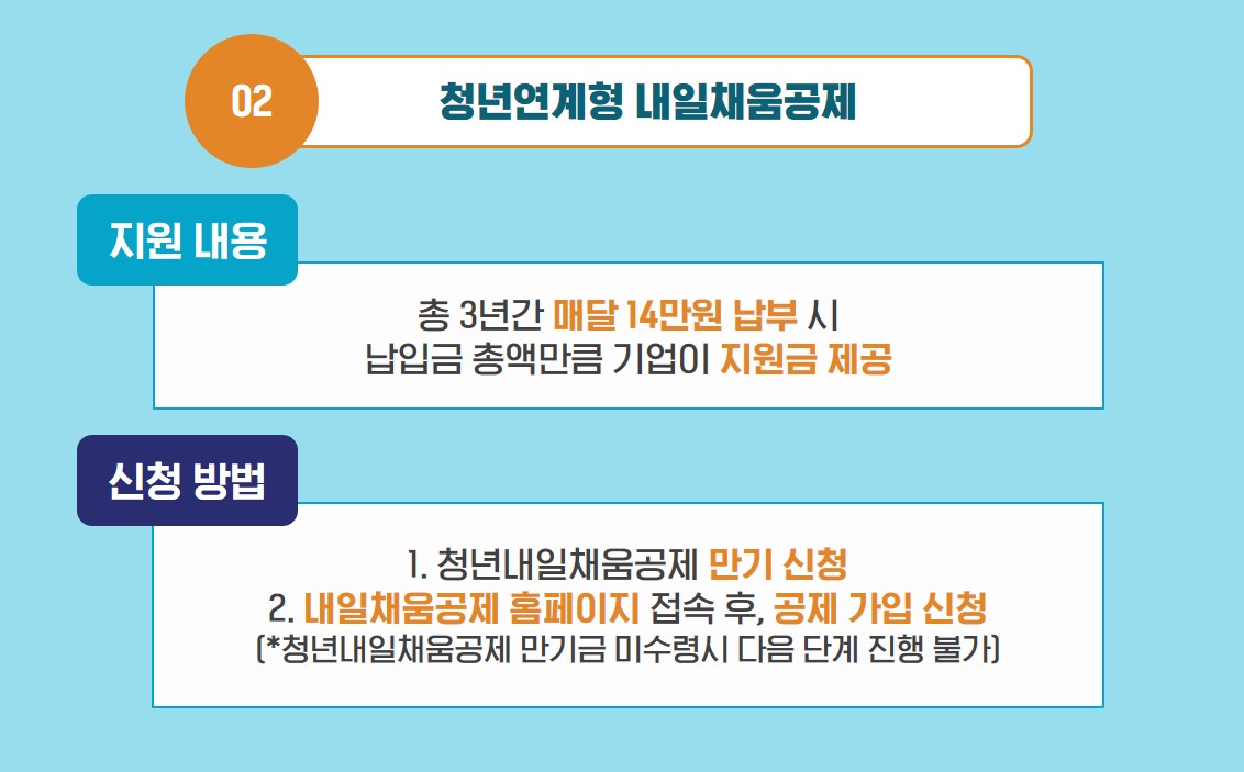 2년 동안 착실히 일하며 청년내일채움공제 만기금을 수령하고 같은 기업에서 커리어를 이어갈 생각이라면, 청년연계형 내일채움공제도 가입해보는 게 어떨까요? 최소 천만원 이상의 목돈 마련 기회가 새로 생겼으니 대상자들은 주목해 주시기 바랍니다!