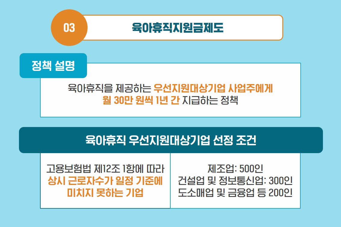 A3. 육아휴직을 허용하는 우선지원대상기업 사업주에게 지원금을 제공하는 ‘육아휴직지원금제도’를 알려 주세요.