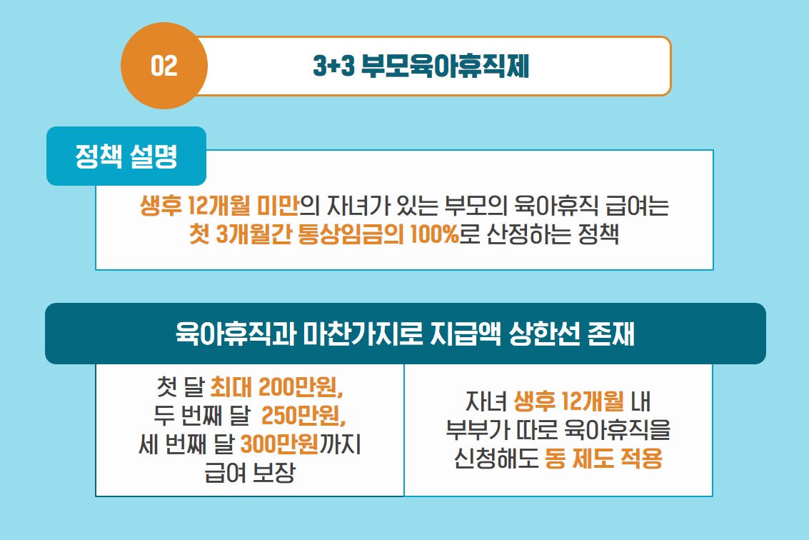 A2. 생후 12개월 미만 자녀를 위한 육아휴직 시 3개월간 월 최대 300만 원을 지급하는 3+3 부모육아휴직제가 내년부터 시행됩니다.