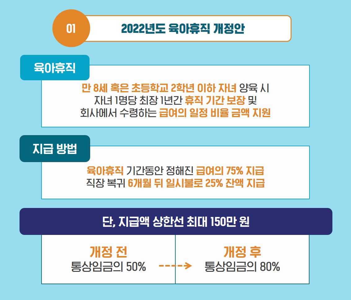 A1. 2022년부터 육아휴직 급여수준이 80%로 인상됩니다.