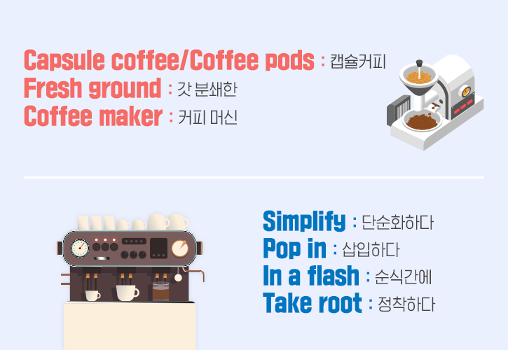 이후 과정은 단순합니다. 커피 머신이 알아서 커피를 내릴 수 있게 과정을 단순화(Simplify) 했기 때문이죠. Simple의 동사형인 Simplify, 잊지 말아 주시길 바랍니다. 캡슐 커피를 기계에 삽입하면(Pop in) 자동으로 절차가 진행되고, 순식간에(In a flash) 커피 한 잔이 만들어집니다. 각 단어에 대한 설명을 드리자면, 우선 간단하게 물건을 툭 넣을 때 Pop in을 활용합니다. 인터넷 서핑 중 불쑥 튀어나오는 창을 팝업(Pop-up)이라고 하는 이유와 비슷하다고 할 수 있죠. 또 In a flash를 직역하자면 ‘빛이 반짝이는 순간에’인데요. 빛보다 빠른 속도는 없기에! 아주 금세 벌어지는 일에 자주 사용된답니다. 편리함과 맛을 동시에 잡은 캡슐 커피의 매력, 빠지면 헤어 나오기 어렵습니다. 이용 빈도 수가 늘어나다가 결국 정착하게 될 시 ‘Take root’라는 표현을 쓰는데요. 단단하게 뿌리내리는 모습에서 착안했다는 점이 흥미롭네요 :)