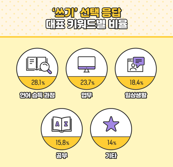 비록 상대적으로 선택 비율은 적었지만, 쓰기 실력을 강조하는 의견도 다양했습니다. 총 5가지 키워드로 분류해 봤는데요. 가장 비중이 높았던 키워드는 타 언어 역량과의 관계 등을 고려한 '언어 습득 과정(28.1%)’이었습니다. 앞서 말하기에도 유사한 범주의 이유가 제시됐는데, 둘 사이엔 어떤 차이점이 있을지 기대해 주시기 바랍니다. ‘업무’를 중심으로 작문 능력의 중요성을 주장한 분들은 23.7%를 차지했습니다. 아무리 세상이 디지털화되어도 공식 문서, 이메일 등 활자 기반 서류가 여전히 쓰인다는 사실은 변치 않기 때문이죠. 이어서 쓰기가 현실과 밀접한 관계라는 ‘일상생활(18.4%)’, 문법 학습 등 학업적 성취에 도움이 된다는 ‘공부(15.8%)’도 상당수의 선택을 받았습니다. 톡톡 튀는 ‘기타’ 의견은 14%로 집계됐네요.