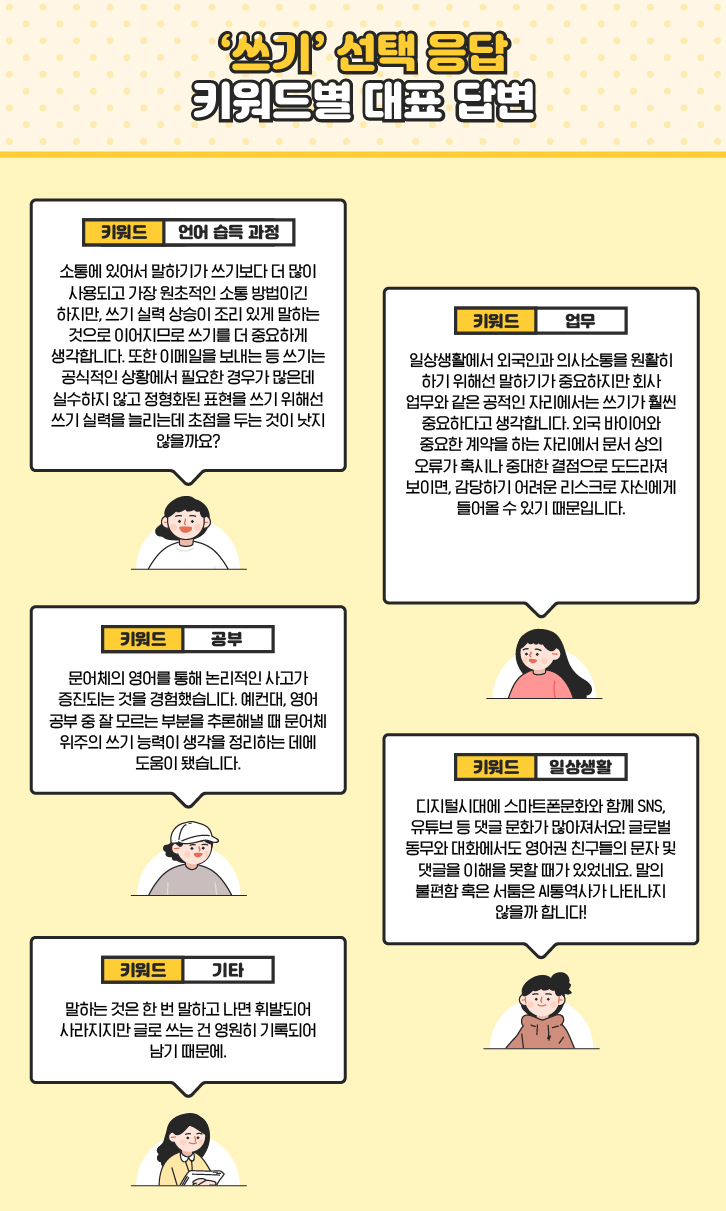 아울러 현업에 몸담고 있는 분께서 현장의 의견을 전달해 주셨습니다. 계약서 작성 등 중요한 공적인 자리에서 문서 내 오류로 일을 그르치게 된다면 큰 문제가 발생할 수 있다는 우려가 녹아 있었는데요. 자칫 법적인 분쟁으로도 이어질 수 있기에, 온전한 정신건강과 원만한 회사 생활을 위해선 쓰기 능력 함양이 필수라고 느껴집니다. 이번에도 말하기와 마찬가지로 기술 변화를 언급한 응답자가 있었습니다. 스마트폰 문화를 예시로 들며 문자 및 댓글 사용 빈도가 늘었다는 일상생활 관련 답변이었는데요. 말하기 중시자와 상반된 관점에도 불구하고, 회화적 어려움은 AI 통역사가 해결해 줄 것이라며 두 역량을 모두 챙기는 관용(?)을 보였습니다 :) 이번 설문조사 결과 정리는 감성적으로 해볼까 합니다. '말하는 것은 휘발되지만, 글은 영원히 기록으로 남는다'라는 시적인 표현으로 쓰기 실력의 중요성을 드러내 주셨는데요. 참여자분의 답변도 하나의 글로 남겨졌다는 사실, 기억해 주시면 감사하겠습니다.
