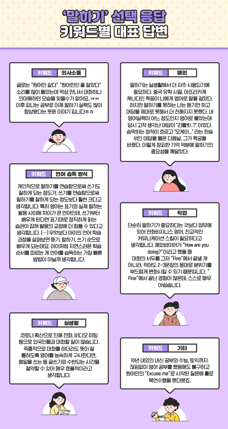 해외 여행, 유학, 근무 등 외국에서 겪은 경험을 토대로 말하기 능력을 중시하는 의견은 11.7%로 조사됐습니다. 현지의 목소리가 담긴 만큼 생생한 이야기를 여럿 확인할 수 있었답니다. 취업과 실무의 관점에서 구두로 영어를 사용하는 실력이 훨씬 필요하다는 ‘직업’은 10.6%였습니다. 구직 활동으로 바쁜 취준생에게는 방향성을, 현업에 종사하고 있는 직장인에게는 공감을 가져오는 항목이라고 할 수 있겠습니다. 그 외 다채로운 시각을 포괄하는 ‘기타(10.4%)’에도 인상적인 내용이 많았는데요. 이 정도로 정리하고 끝내는 건 보내주신 소중한 의견들에 대한 예의가 아니기에! 각 키워드별 대표 답변을 살피러 가보겠습니다.