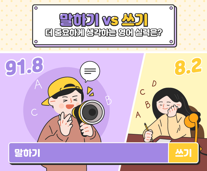 말과 글은 의사소통의 기본 수단입니다. 우리는 말을 하거나 듣고, 글을 읽거나 쓰면서 서로의 생각과 감정을 나누죠. 따라서 언어의 4대 역량을 청해, 회화, 독해, 작문이라고 부르곤 합니다. 어떤 능력이 가장 중요한지에 대해선 늘 첨예한 대립이 있어 왔습니다. 특히 회화와 작문은 능동적으로 활용된다는 공통점을 갖지만, 동시에 구어체와 문어체가 나뉘는 등 엄연한 차이도 보이기에 의견이 자주 갈리는데요. 과연 <토익스토리> 가족 여러분은 둘 중 어떤 실력을 더 중요시했을지! 총 1,430분이 참여해 주신 이번 설문조사 결과, 함께 만나보시죠 :)