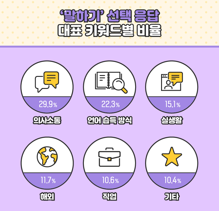 먼저 말하기의 중요성에 대해 수많은 의견이 모였는데요. 하나씩 직접 읽어보고 분석해 본 결과, 총 6가지 키워드를 도출할 수 있었습니다. 우선 회화를 할 줄 알아야 상대방과 간편하게 직접 교류할 수 있다는 맥락의 '의사소통'을 꼽은 분들이 29.9%로 가장 많았습니다. 언어의 본질을 놓고 보면 말하기의 효용 가치가 더 높다고 판단한 것이죠. 이어서 언어를 배우는 방법과 과정, 타 언어 역량과의 상관성을 고려한 ‘언어 습득 방식’이 22.3%를 기록했습니다. 한국인 대부분이 외국어로 영어를 배운다는 점이 반영됐다고 보이네요. 아울러 삶을 살아가며 활용할 기회가 훨씬 많다는 의미의 ‘실생활(15.1%)’도 꽤 큰 지분을 차지했습니다. 당연히 사용 빈도 수가 많아야 살아있는 언어를 구사한다고 말할 수 있겠죠?