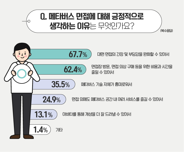 한편 가상 공간이 제공하는 여러 재미가 설문 참여자에게 와닿기도 했습니다. '메타버스 기술 자체가 흥미로워서' 긍정적인 인식을 가졌다는 분들이 35.5%에 이르렀는데요. 과거 통신 기술 발전에 따라 온라인 게임 열풍이 불었을 때처럼 혁신적인 기술에 대한 흥미도가 상당한 것으로 사료됩니다. 이어서 ‘면접 외에도 메타버스 공간 내 여러 서비스를 즐길 수 있다’와 ‘아바타를 통해 개성을 더 잘 드러낼 수 있다’는 의견이 각각 24.9%, 13.1%로 나타났습니다. 팝업 스토어, 브랜드 체험관 등 면접 외 분야에서의 서비스가 가상 공간에 함께 자리하곤 하며, 메타버스 접속 시 캐릭터 제작이 필수라는 점이 영향을 끼쳤다고 볼 수 있겠네요.