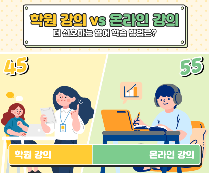 두 강의 형태 모두 저마다의 장점이 있는 만큼 팽팽한 결과가 도출됐습니다. '학원 강의’를 선택한 비율이 45%, ‘온라인 강의’는 55%로 드러났는데요. 구체적으로 어떤 측면이 선택에 영향을 끼쳤을까요? 보내주신 의견을 한데 모아 정리해 본 세부 이유를 바로 소개해 드리겠습니다!