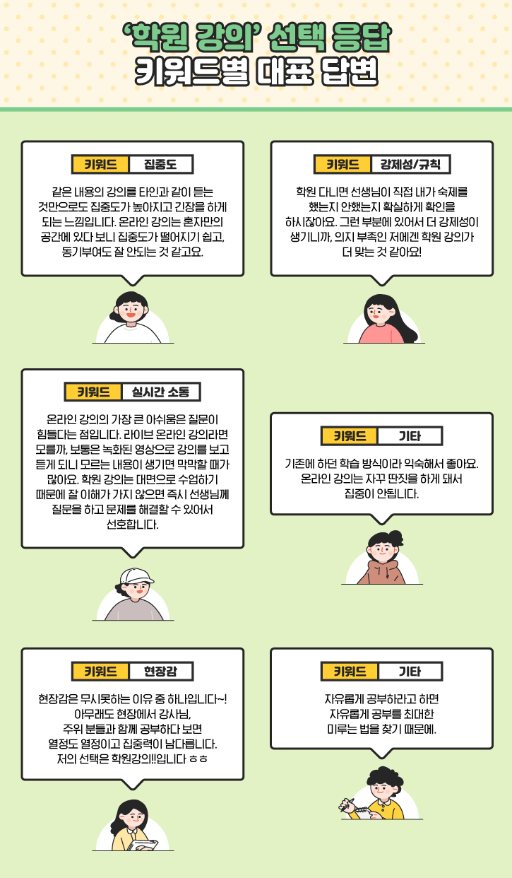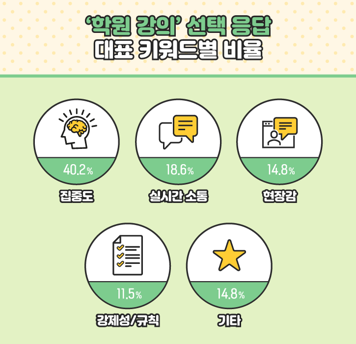 온라인 강의와 비교했을 때 출석체크, 과제 검사 등 더 체계적인 관리가 가능하다는 점에 주목한 의견도 있습니다. 관련해 '강제성/규칙’을 이유로 꼽은 응답자가 11.5%로 나타났죠. 마지막으로 상기 키워드에는 포함되지 않지만 자신만의 여러 이유로 학원 강의가 더 잘 맞는다고 생각하는 분들도 14.8%에 이른 것으로 조사됐답니다.