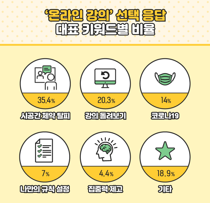 강의 돌려보기 기능을 통해 놓치는 내용 없이 꼼꼼히 공부할 수 있다는 사실을 강조한 얘기도 보였습니다. 시간을 돌릴 뿐 아니라 영상 재생 속도를 조절해 수업 내용을 100% 자기 것으로 만들어 가는 모습은 정말 바람직하게 느껴지네요. 아울러 코로나19와 관련해선 대면 강의의 부담감을 덜고 마스크를 벗은 채 공부할 수 있다는 매력을 강조해 주셨습니다. 또 쪽지시험 및 발표에 얽매이지 않고 주도적 학습이 가능해 자신만의 규칙을 설정하는 걸 중시하는 분도 있었죠. 그 외 잡담 없이 집중해서 공부할 수 있다는 점과 시간 낭비를 줄여 예습에 활용하겠다는 의견도 확인할 수 있었답니다 :)