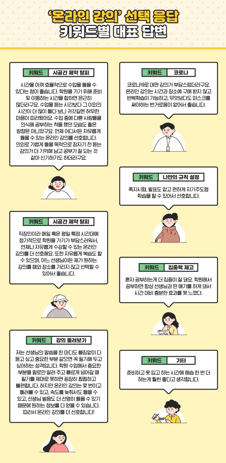 우선 시공간 제약 탈피에 대해 다양한 이유를 전달해 주신 답변이 있었습니다. 학원에 갈 때 필요한 준비 및 이동 시간이 아깝고, 타인을 의식하며 공부하는 스타일이 바람직하지 못하다는 이야기였는데요. 특히 잠자기 전에 가볍게 강의를 들으면 머리에 쏙쏙 들어온다는 꿀팁도 전수해 주셨습니다. 또한 치열한 직장 생활로 고정 스케줄을 잡기 어려운 분도 목소리를 전해 주셨습니다. 때와 장소를 가리지 않고 원하는 수업을 들을 수 있는 장점이 고스란히 묻어났네요.