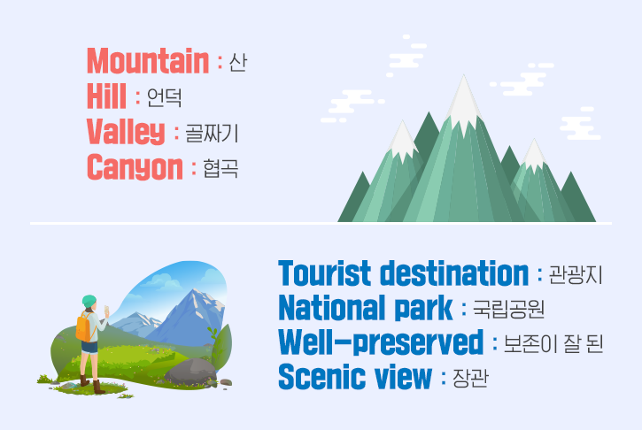 등산객이 많이 방문하는 산은 관광지(Tourist destination)로 소개되기도 합니다. 말 그대로 관광객(Tourist)의 도착지(Destination)이라는 뜻으로 단어가 결합했죠. 나아가 환경적, 역사적인 의미까지 지닌 공간일 경우 국립공원(National park)으로 지정되는데요. C 씨와 같은 실수를 하지 않기 위해선, 국립공원에서 자라는 식물은 눈으로만 구경해 주세요! 엄격한 관리 덕에 보존이 잘 된(Well-preserved) 산은 등산객에게 특별한 감흥을 줍니다. 푸른 수목과 화사한 꽃이 가히 장관(Scenic view)을 이루는 풍경, 오래오래 볼 수 있도록 모두 노력했으면 하는 바람입니다 :)