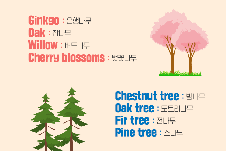 이처럼 샛노란 잎 색깔과 냄새나는 열매의 대비로 유명한 은행나무는 'Ginkgo’입니다. 또 국내 산림에서 흔하게 만나볼 수 있으며 옹골진 열매가 열리는 참나무는 ‘Oak’입니다. ‘오크 재질의 원목 인테리어’ 등 일상에서도 자주 쓰이는 단어이니 꼭 확인해 주세요. 아울러 길게 늘어진 잎이 눈길을 끄는 버드나무는 ‘Willow’이고, 흐드러지는 꽃으로 봄의 대미를 장식하는 벚꽃나무는 ‘Cherry blossoms’라고 부른답니다.