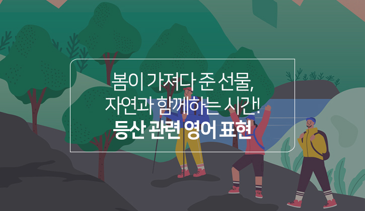 한국인은 등산의 민족이라고 불려도 손색이 없습니다. 우리나라 국토의 65%가량이 산지인 만큼 산악회 등 등산 문화가 잘 자리 잡았죠. 찬란한 햇살과 따뜻한 바람이 불어오는 요즘이 등산하기에 최적의 타이밍이 아닌가 싶습니다. 저마다의 매력을 한껏 뽐내는 꽃과 나무 덕에 시각적인 행복감을 얻을 수 있기 때문인데요. 자연경관을 즐기기 위해서든, '산이 거기 있으니 오른다’라는 말처럼 정상을 향한 일념에 의해서든 등산에 관심을 갖는 모든 분들을 위해 등산 관련 영어 표현을 준비했습니다. 지금 만나보시죠 :)