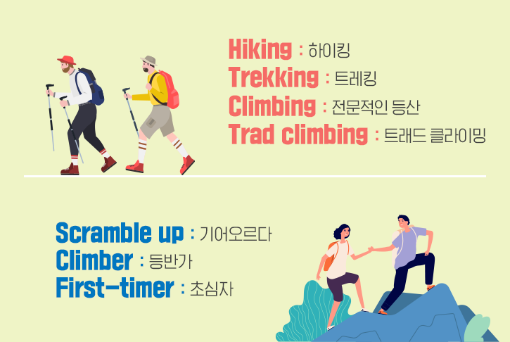 A 씨가 등산로에서 겪은 곤경엔 분명 힘겹게 산을 기어오르는 순간도 있었을 테죠. 'Scramble up’은 이렇게 어딘가를 기어오를 시에 말할 수 있는 표현인데요. 스크램블 에그(Egg scramble)를 만들 때처럼 정신없이 앞을 짚으며 나아간다고 생각하면 쉽게 까먹지 않을 겁니다. 어느 등산법을 택하든 산을 오르는 등반가라면 자신을 ‘Climber’라고 소개할 수 있습니다. 단, 초심자라면 어려움을 마주하기 전에 먼저 ‘First-timer(초심자)’라고 밝히는 게 현명하겠죠? :)