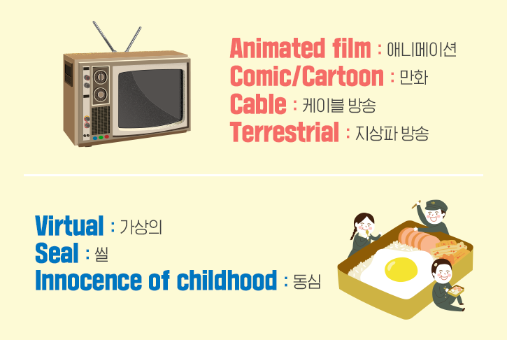 애니메이션엔 인간이 아닌 가상의(Virtual) 캐릭터가 등장합니다. 참고로 가상현실을 지칭하는 VR은 Virtual Reality의 약자라는 점도 체크해 주세요. 포켓몬 빵 대란의 주인공이자 만화 캐릭터를 현실로 불러내는 씰은 ‘Seal’입니다. 편지 등을 봉인할 때 쓰는 도장을 말하기도 하죠. 어린 시절 봤던 애니메이션을 보면 마치 그때로 돌아간 듯한 느낌이 듭니다. 여러분의 마음속에 되살아난 동심, 영어로는 ‘Innocence of childhood’랍니다!
