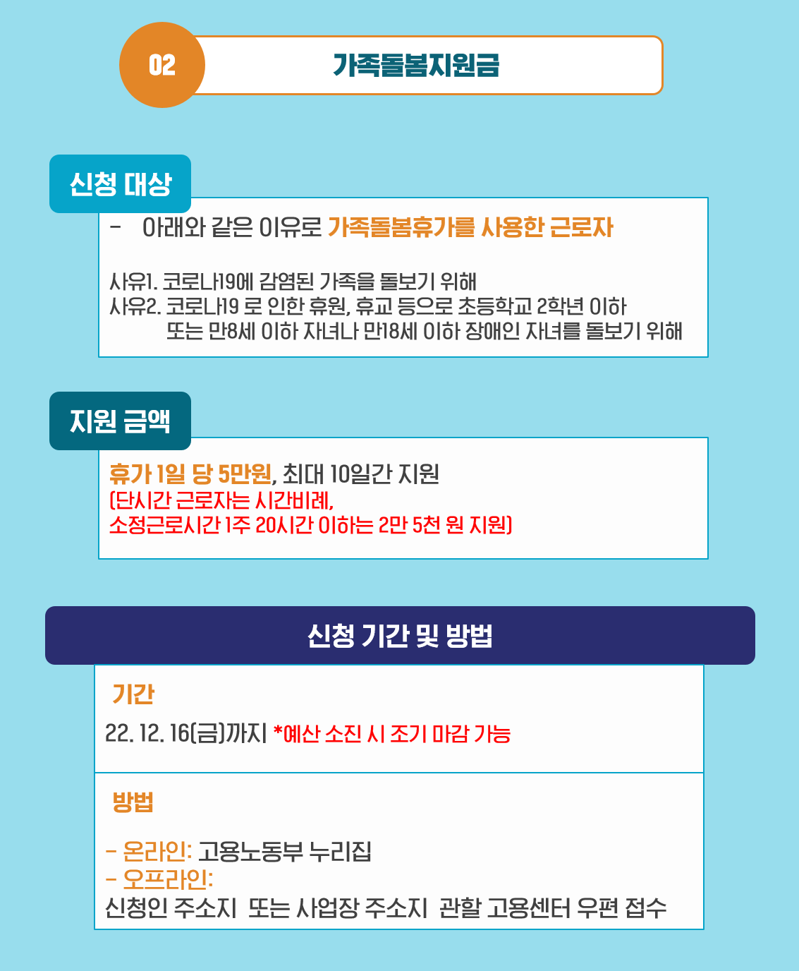 지난 2020년부터 진행해온 이 제도는 코로나19 감염 가족의 간병이나 코로나19로 인한 휴원ㆍ휴교 등으로 직접 자녀를 돌봐야 해 가족돌봄휴가 중인 근로자의 한해 신청 가능합니다. 다만, 전자의 경우에는 코로나19 감염 가족의 나이에 상관없이 신청 가능하지만, 후자의 경우에는 자녀가 초등학교 2학년 또는 만 8세 이하인 경우나 만 18세 이하의 장애인인 경우에 한정해 신청할 수 있다고 하네요.