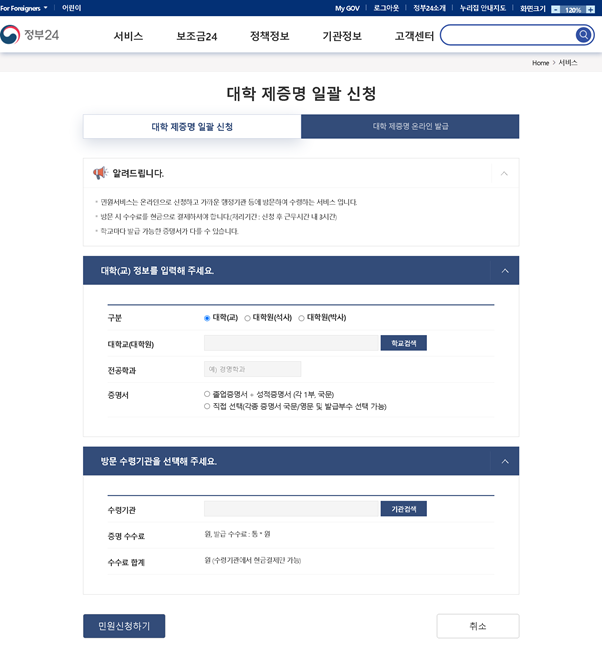 취업 서류 편의 서비스 ①: 대학 제증명 일괄 신청 서비스