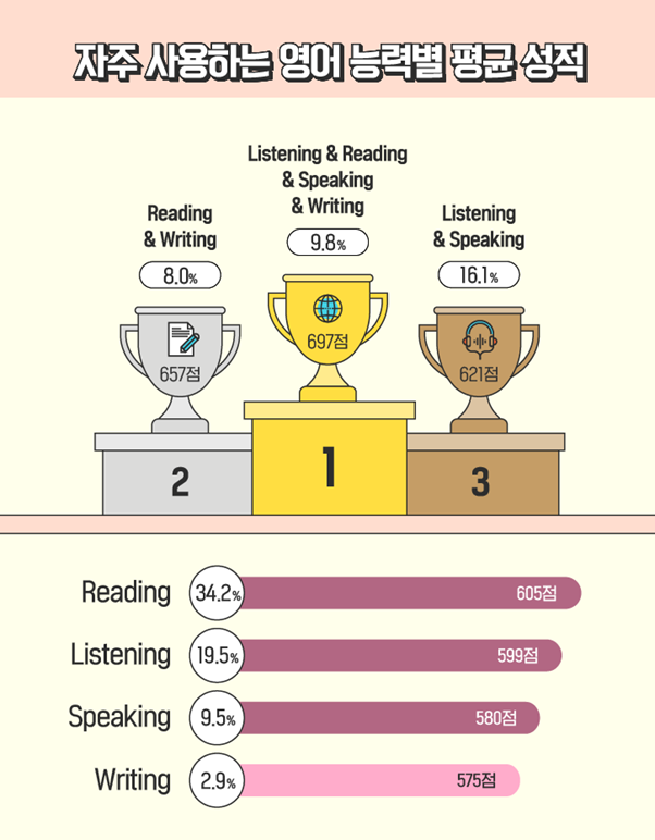 ‘듣기ㆍ읽기ㆍ말하기ㆍ쓰기’ 중 응시자가 가장 자주 사용하는 능력에 따라서도 성적 차이가 나타났는데요. 이 네 가지 능력을 모두 자주 사용하는 환경에 있는 응시자 평균 성적은 697점으로 집계됐습니다. 아무래도 모든 능력을 고르게 사용하다 보니 자연스레 영어 실력도 향상될 수밖에 없겠죠?