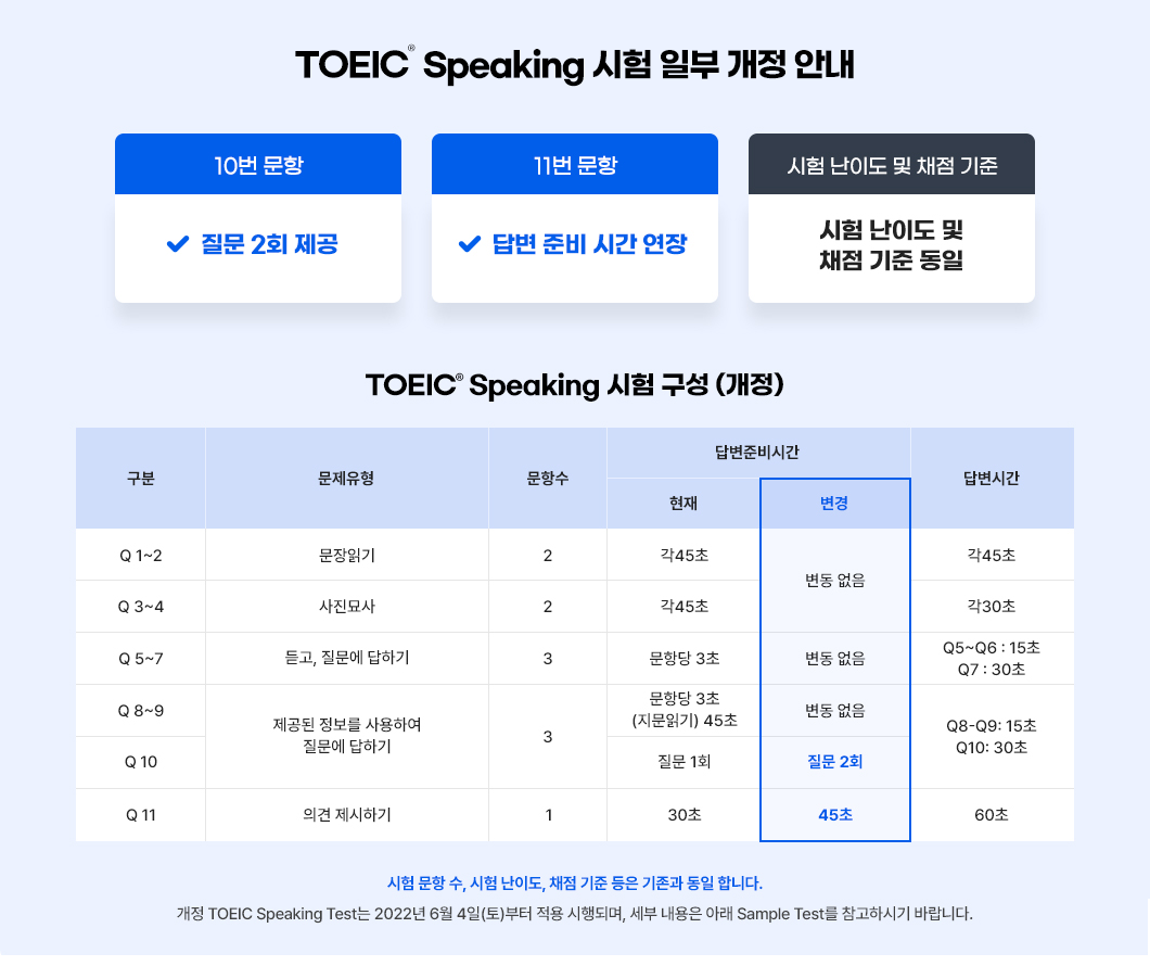 2022년 6월 4일(토)부터 토익스피킹 성적 체계 개편 및 시험 구성 일부가 개정되었습니다.