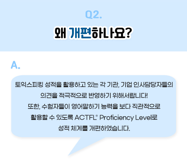 A. 토익스피킹 성적을 활용하고 있는 각 기관, 기업 인사담당자들의 의견을 적극적으로 반영하기 위해서랍니다!
