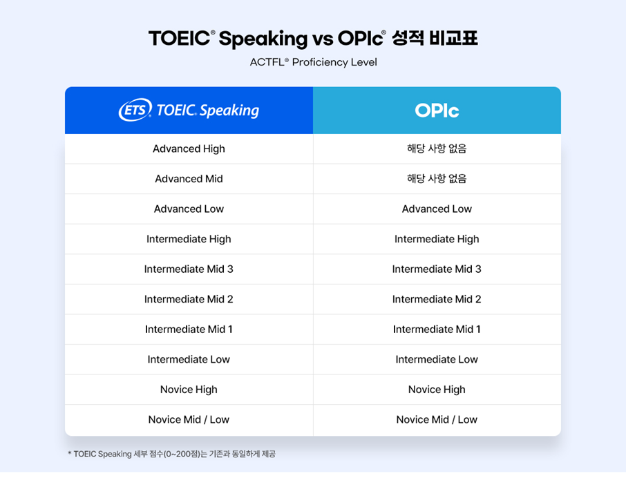 또한, 수험자들이 영어 말하기 능력을 보다 직관적으로 활용할 수 있도록 ACTFL® Proficiency Level 로 성적 체계를 개편하였습니다.