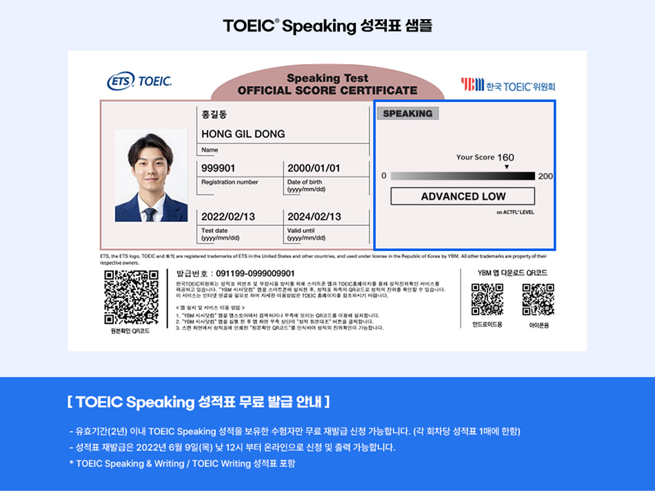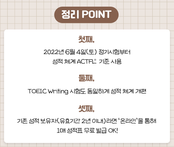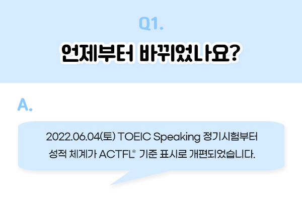 A. 2022.06.04(토) 토익스피킹 정기시험부터 성적 체계가 ACTFL® 기준 표시로 개편되었습니다.