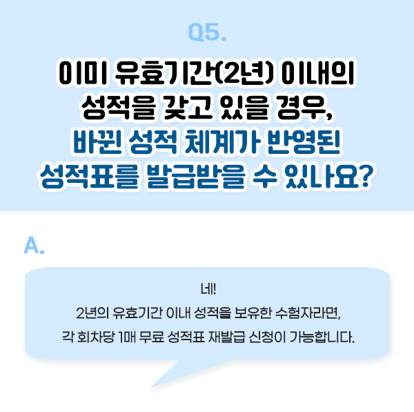 Q. 저는 이미 유효기간(2년) 이내의 성적을 갖고 있습니다. 저도 바뀐 성적 체계가 반영된 성적표를 발급받을 수 있나요?