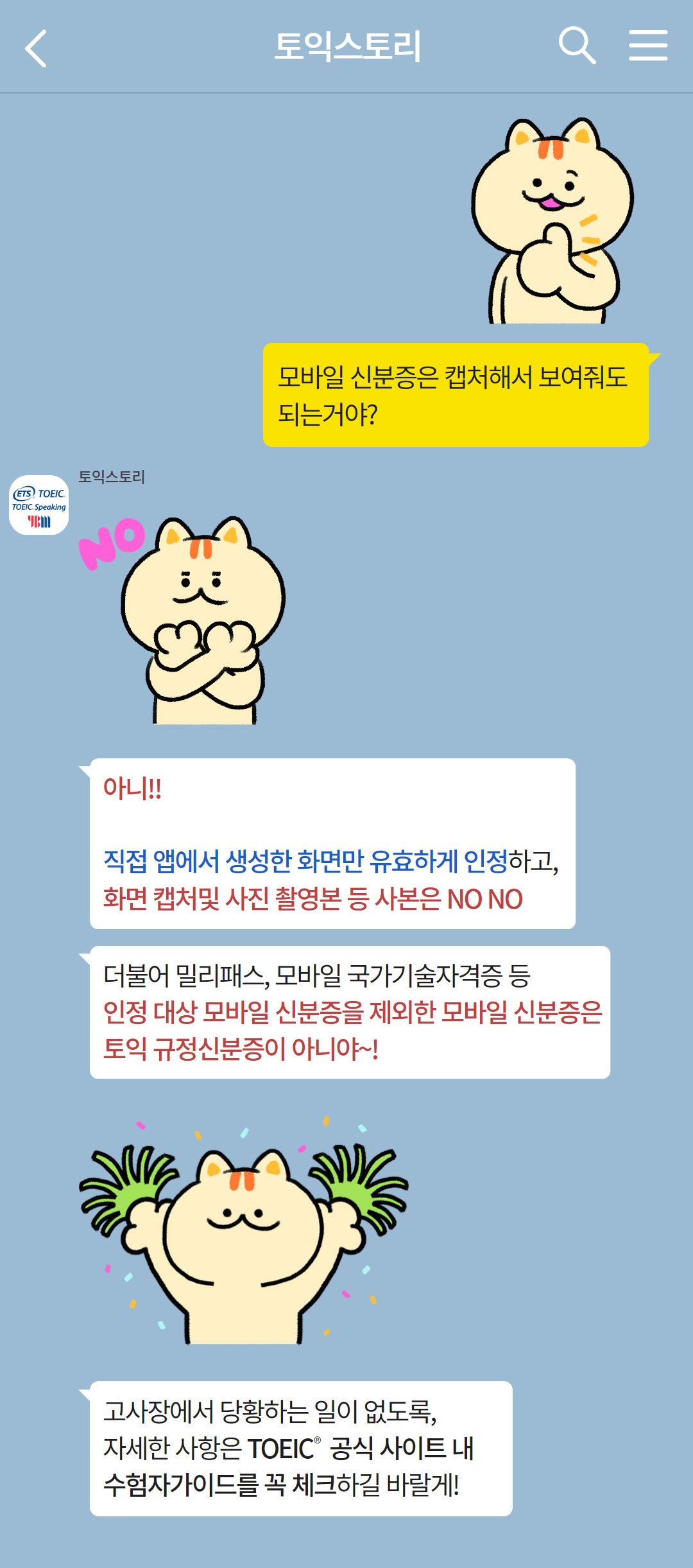 이에 따라 한층 더 간편해진 토익 규정 신분증! 꼼꼼히 확인하시고 고사장에서 당황하는 일이 없도록 주의해주세요! <토익스토리>는 여기서 인사드리겠습니다 😊