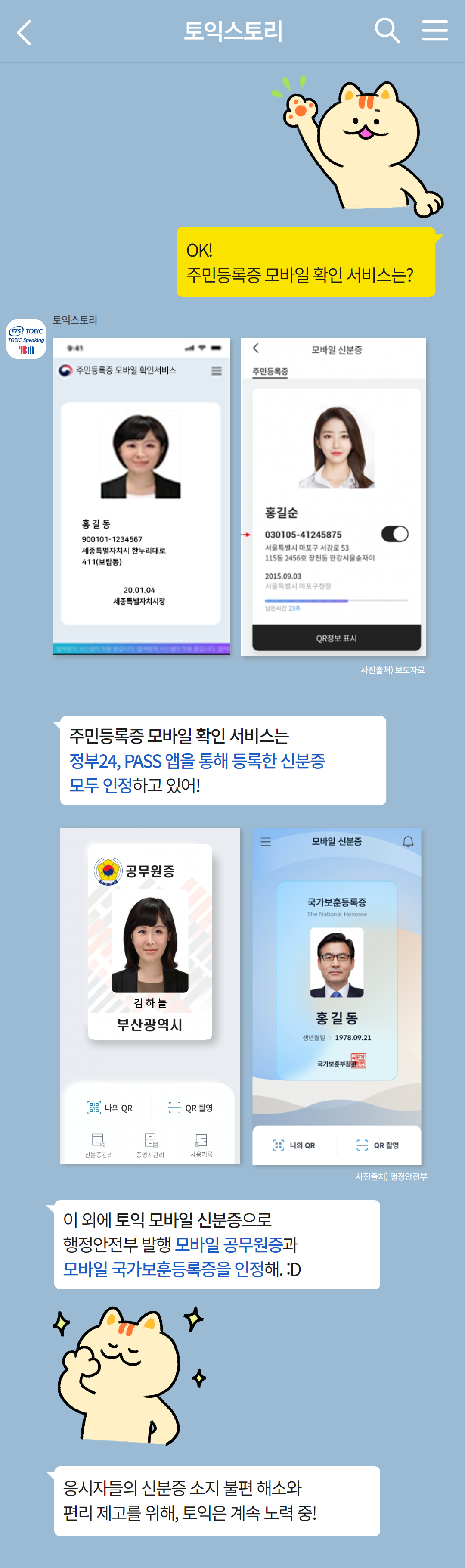 토익에서는 도로교통법에 따라 지방경찰청장이 발급한 ‘모바일 운전면허증’, 정부24와 PASS앱을 통한 ‘주민등록증 모바일 확인서비스’, 행정안전부 발행 ‘모바일 공무원증’, 모바일 국가보훈등록증만 규정 ‘모바일 신분증’으로 인정합니다.