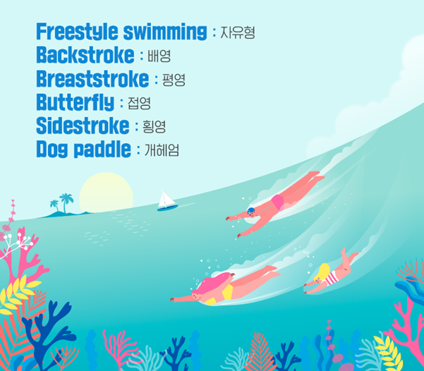 이 외에도 자세에 따라 영법을 나눌 수 있는데요. 하늘을 바라보고 누워서 헤엄을 치는 배영은 ‘Backstroke’, 얼굴을 수면 위로 내밀고 옆으로 누워 수영하는 횡영은 ‘Sidestroke’라고 합니다. 마치 개구리처럼 물과 수평을 이루며 팔다리와 함께 가슴이 수면을 오가며 물을 박차는 평영은 ‘Breaststroke’라고 하네요! 각각 자세의 특징에 따라 ‘Back(등)’, ‘Side(옆)’, ‘Breast(가슴)’과 ‘Stroke(수영법)’이 합쳐진 표현입니다. 영법의 영어 표현을 잘 기억해 두었다가, “I learned backstroke and sidestroke this summer! (나 이번 여름에 배영이랑 횡영을 배웠어!)” 와 같이 올여름 수영 레슨에서 내가 배운 수영법을 자랑할 때 활용해볼 수 있겠죠? :)