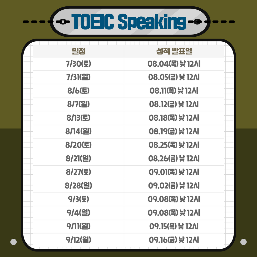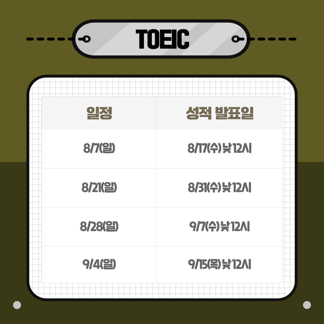 <토익스토리>가 지금 시험 응시하면 카투사 지원 일정에 맞춰 성적을 제출할 수 있는 토익, 토익스피킹 시험 일정을 소개해 드립니다. 시험 일정에 따라 접수 기간이 상이하니 홈페이지 시험 일정을 꼼꼼히 체크하는 것은 필수!