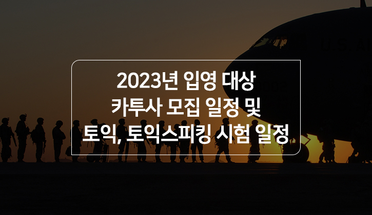 2023년도 입영 대상 카투사 모집 일정 및 지원 자격 꼼꼼히 확인하셨나요? 카투사에 지원하기 위한 필수 자격인 토익, 토익스피킹 성적은 접수 시점에 어학점수를 취득한 상태여야 한다는 점 다시 한번 알려드립니다. 어학성적이 불일치하거나, 유효기간이 지나 조회 불가능한 경우에는 선발 제외될 수 있습니다. 미리 준비하시고 확인하셔서 모두 좋은 결과 있으시길 바랍니다 :)