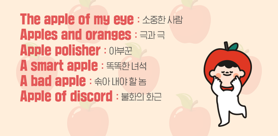 옛 영어에서 ‘Apple(사과)’은 눈동자(pupil)를 의미했다는 사실, 알고 계셨나요? 둥근 눈동자의 모습이 사과와 비슷해 붙여진 이름입니다. 여기서 나온 표현이 바로 'Apple of my eye'입니다. 자신의 눈동자에 가득 담고 싶을 정도로 매우 사랑스럽고 소중한 사람을 뜻하는 표현이죠. 자신의 소중한 사람에게 마음을 전하고 싶을 때, “You are the apple of my eye. (너는 내게 아주 소중한 사람이야.)”라고 마음을 전해봐도 좋을 것 같네요. 영국에서는 과거에 사과와 관련한 특이한 관습이 있었는데요. 바로 학부모가 학교 선생님께 사과를 선물하는 것이었다고 합니다. 이때 선생님께 잘 보이고자 하는 마음에 사과를 반질반질 닦아서 주던 것에서 나온 표현이 바로 ‘아부꾼’을 뜻하는 ‘Apple polisher’라고 합니다.
