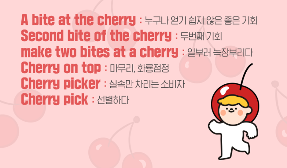 ‘A bite at the cherry’는 ‘누구나 얻기 쉽지 않은 좋은 기회’를 뜻합니다. 특히 너무 작아 두 입에 나누어 먹기 어려운 체리처럼, 다시 오기 어려운 일생일대의 기회를 말할 때 자주 사용되곤 하죠. 그런 의미에서 ‘Second bite of the cherry’라는 표현의 의미는 무엇일까요? 그 어려운 체리를 두 입에 나누어 먹었다는 점에서 짐작할 수 있듯, 기적적으로 찾아온 ‘두 번째 기회’를 뜻한다고 하네요. 참고로 ‘Make two bites at a cherry’는 한 입에 먹을 수 있는 체리를 굳이 두 입에 나누어 먹는다는 의미로 ‘일부러 늑장 부리다’라는 뜻이 있다는 점 알아두시면 좋을 것 같습니다. :)