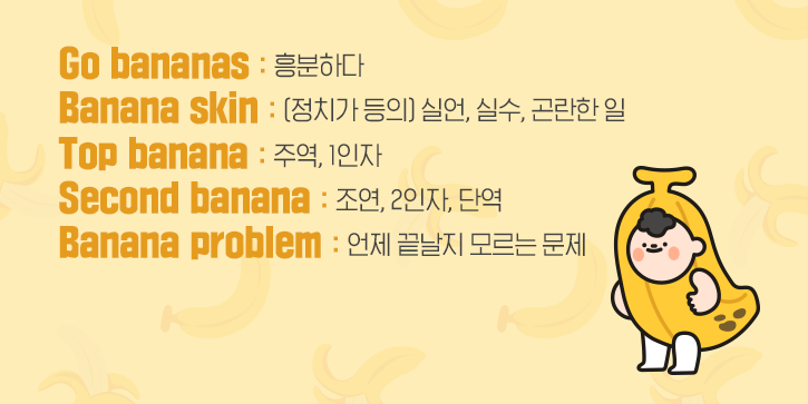 또 다른 재미난 표현으로는 ‘Banana problem’이 있습니다. 이것은 바나나의 스펠링(Spelling)에 관한 재미난 에피소드에서 탄생했는데요. 알파벳 ‘A’가 연속으로 세 번이나 나오다 보니 미국 어린이 사이에서는 "I know how to spell 'banana', I just don't know when to stop. (나는 '바나나'의 스펠링을 알지만, 언제 멈춰야 할지를 모르겠어요.)”라는 재미난 이야기가 나오게 됐고, 여기서 ‘언제 멈출지 모르는 문제’라는 뜻의 ‘Banana problem’이라는 표현이 탄생한 것이죠!