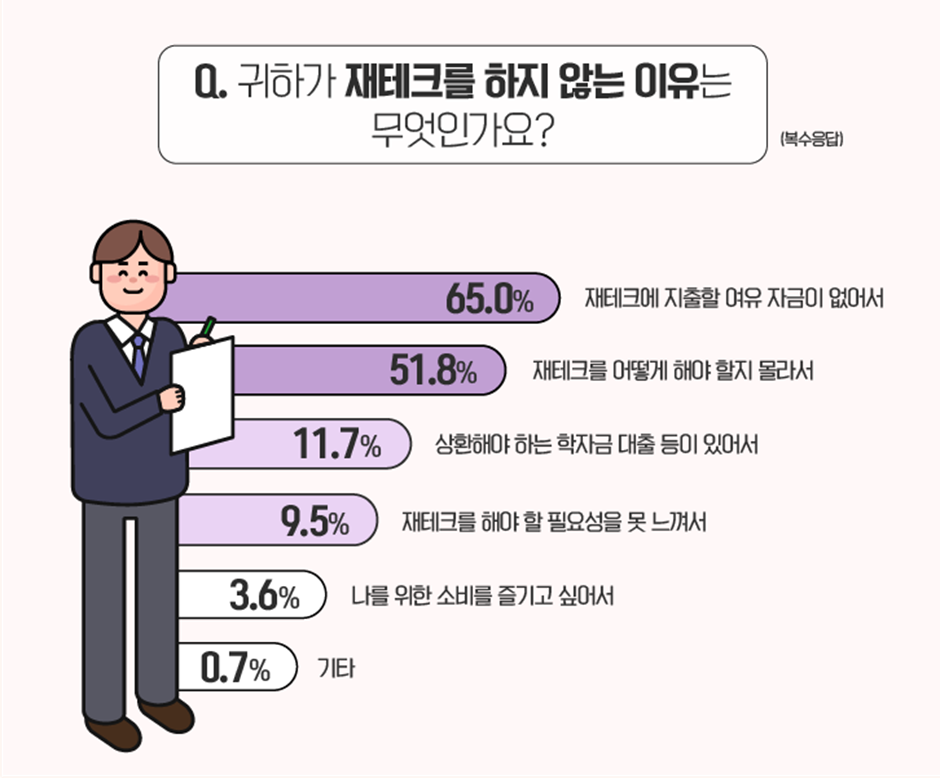 한편, 재테크를 하지 않는 분들의 의견은 어떨까요? 먼저 그 이유를 묻는 질문에 ‘재테크에 지출할 여유 자금이 없다’는 대답이 65%에 달했으며, ‘재테크를 어떻게 해야 할지 모른다(51.8%)’는 응답도 과반수를 차지했습니다. 재테크를 하고 싶어도 현재 경제 사정이 여유롭지 못하거나 하는 방법과 종류가 다양해 시작하는 데에 어려움이 존재하는 듯하네요. 다음으로는 ‘상환해야 하는 학자금 대출이 있다(11.7%)’, ‘재테크를 할 필요성을 못 느낀다(9.5%)’, ‘나를 위한 소비를 즐기고 싶다(3.6%)’는 응답이 뒤를 이었습니다. 미래보다는 현재에 더 투자하고 싶다는 의견도 확인할 수 있네요!